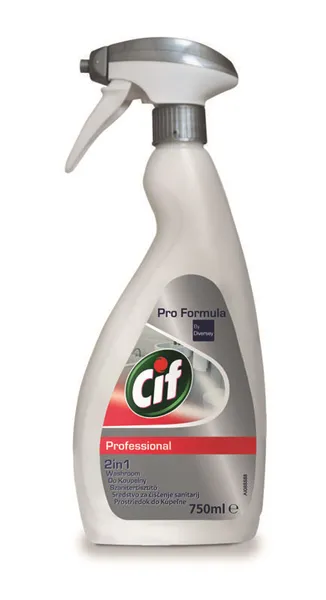 Cif Washroom 2in1 odstraní vodní kámen, nečistoty a zbytky mýdla a zanechá zářivý lesk a dlouhotrvající svěží vůni.