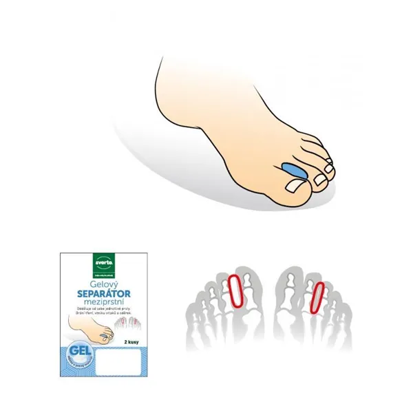 Gelový separátor meziprstní . Roztahuje a odděluje prsty a chrání bolestivá místa. Zabraňuje poškozování dvou prstů vedle sebe.