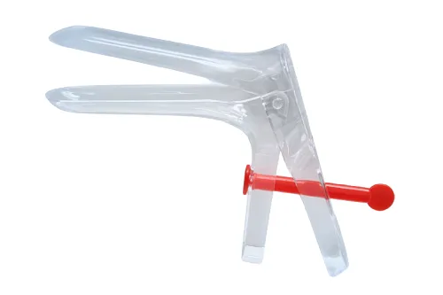 Jednorázové gynekologické zrcadlo z pevného a čirého plastu.