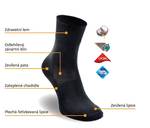 • Zesílená špice a pata zajišťují vysoké pohodlí uživatele a přispívají k vyšší trvanlivosti produktu právě zesílením namáhaných částí ponožky.