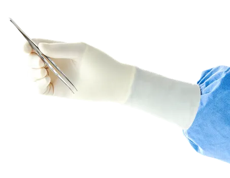 Latexová chirurgická rukavice bez pudru s mikrotexturovanou úpravou pro bezpečnou manipulaci s nástrojem a úchop.