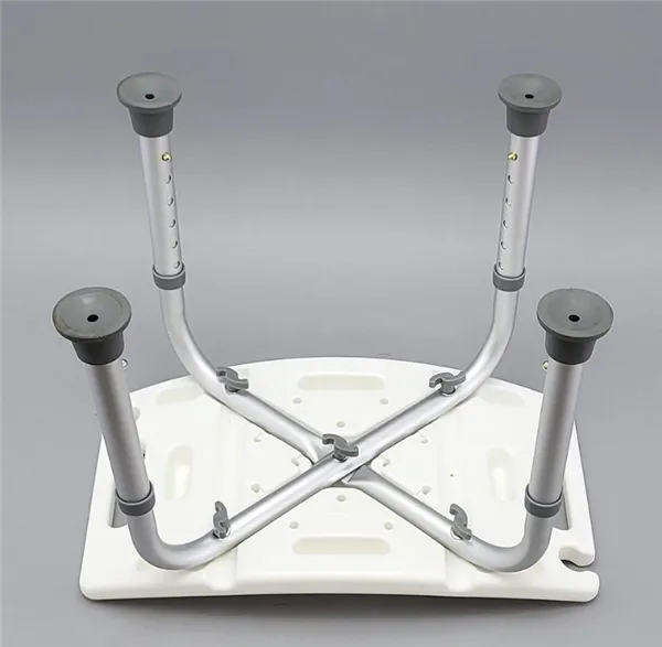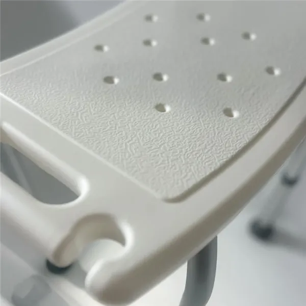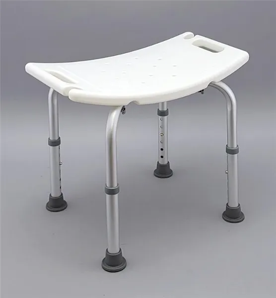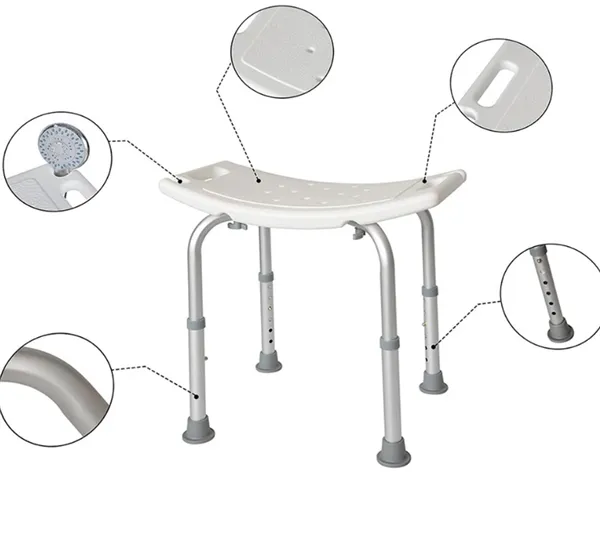 Praktická výškově nastavitelná sprchovací stolička s výřezem pro odložení sprchové hlavice, vhodná pro osoby s omezenou pohyblivostí.