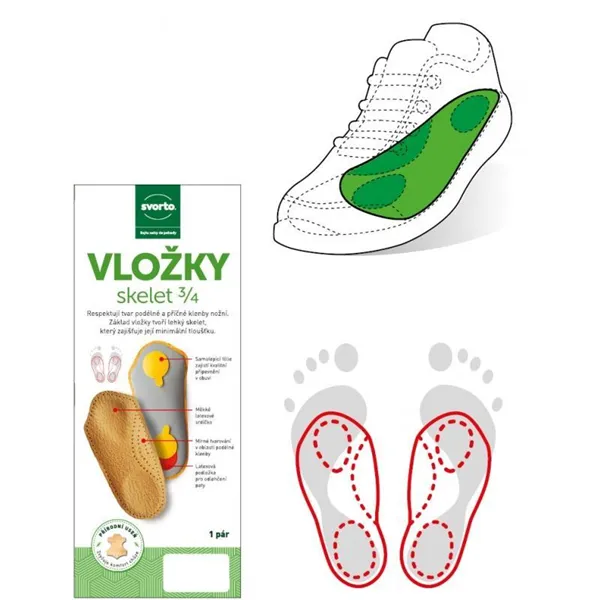 Vložky skelet 3/4. Vložky zmírňují příznaky související s poklesem podélné i příčné klenby, mezi které patří pocit těžkých nohou, zvýšená únavnost a trnutí nohou, nepříjemné bolestivé pocity, otoky, pálení a další. Vložky jsou také možnou prevencí vzniku a zhoršování problému vbočeného palce. Vložky mohou poskytnout citelnou úlevu nejen nohám, ale také kolenům, kyčlím či zádům.