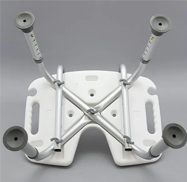 Praktická výškově nastavitelná sprchovací židle s hygienickým výřezem a výřezem pro odložení sprchové hlavice, vhodná pro osoby s omezenou pohyblivostí.
